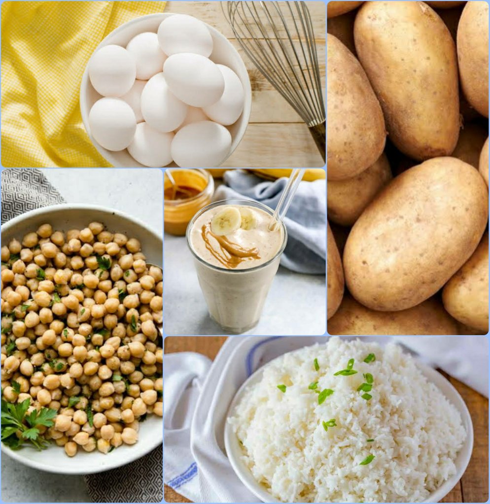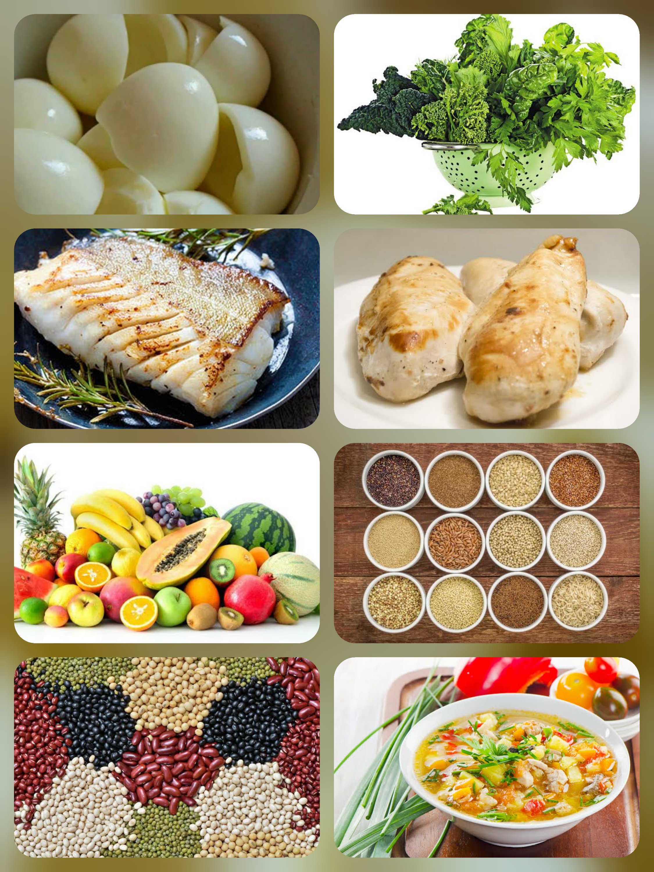 Egg white,Green leafy vegetables, Fish,Chicken-breast,Fruits,Whole grains,Legumes,Soups.
